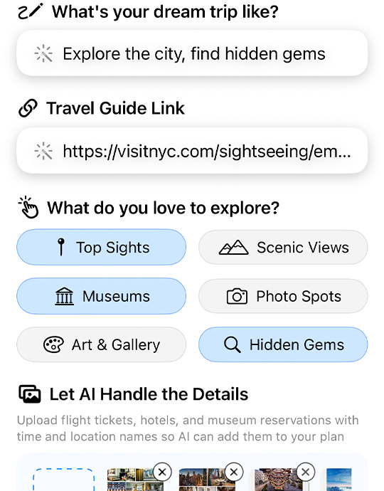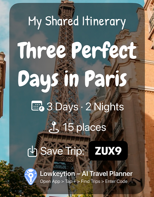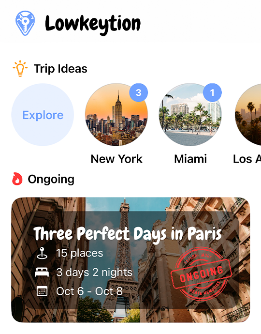 Whether you plan from scratch, use AI, or copy curated trips, Lowkeytion maps every stop, organizes your days, and makes sharing or collaborating